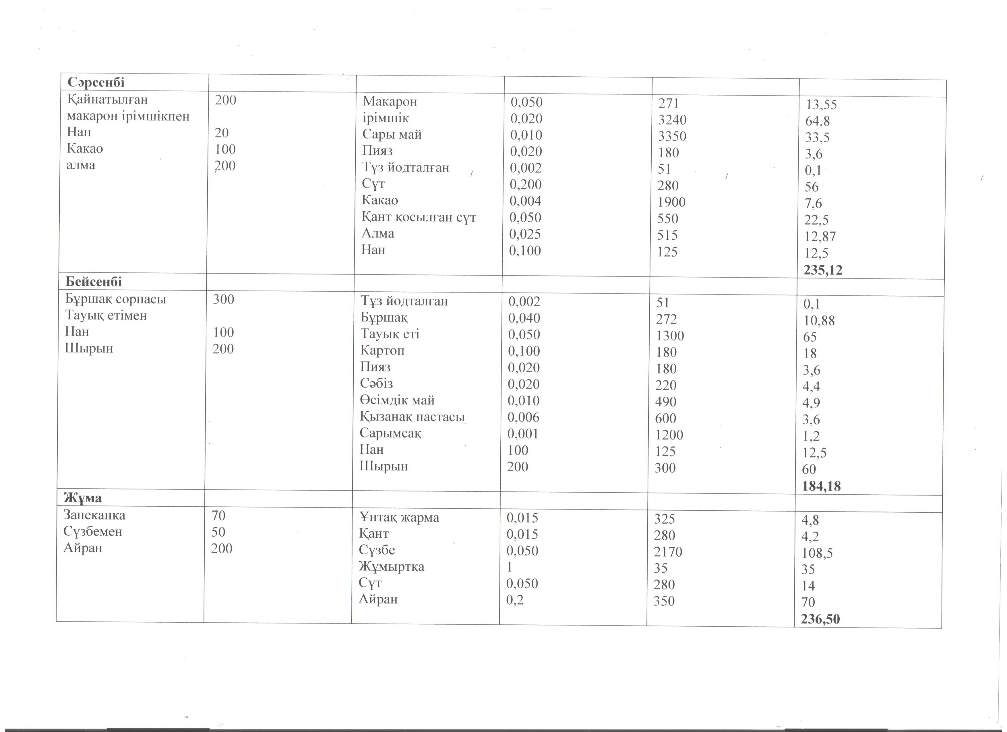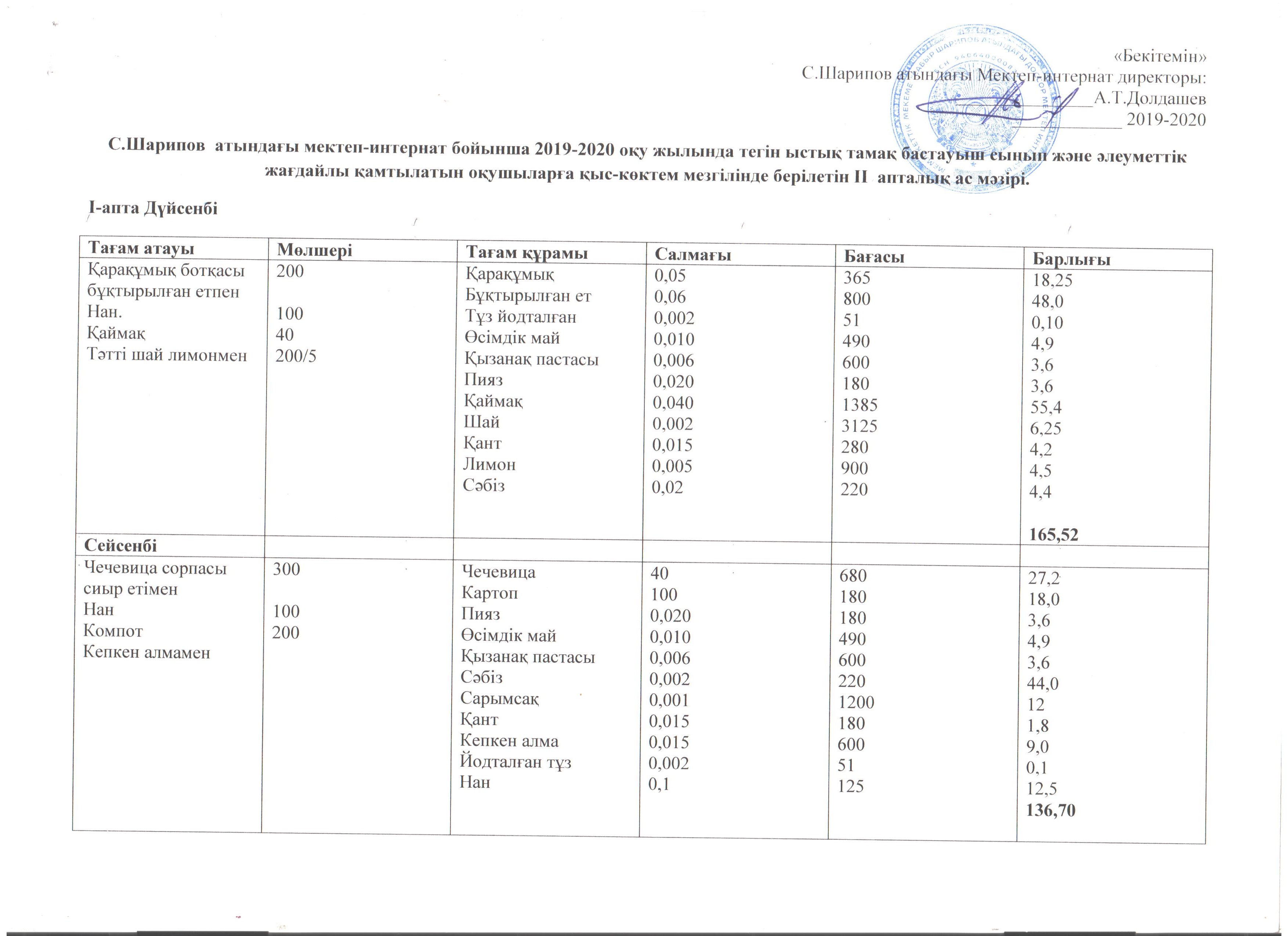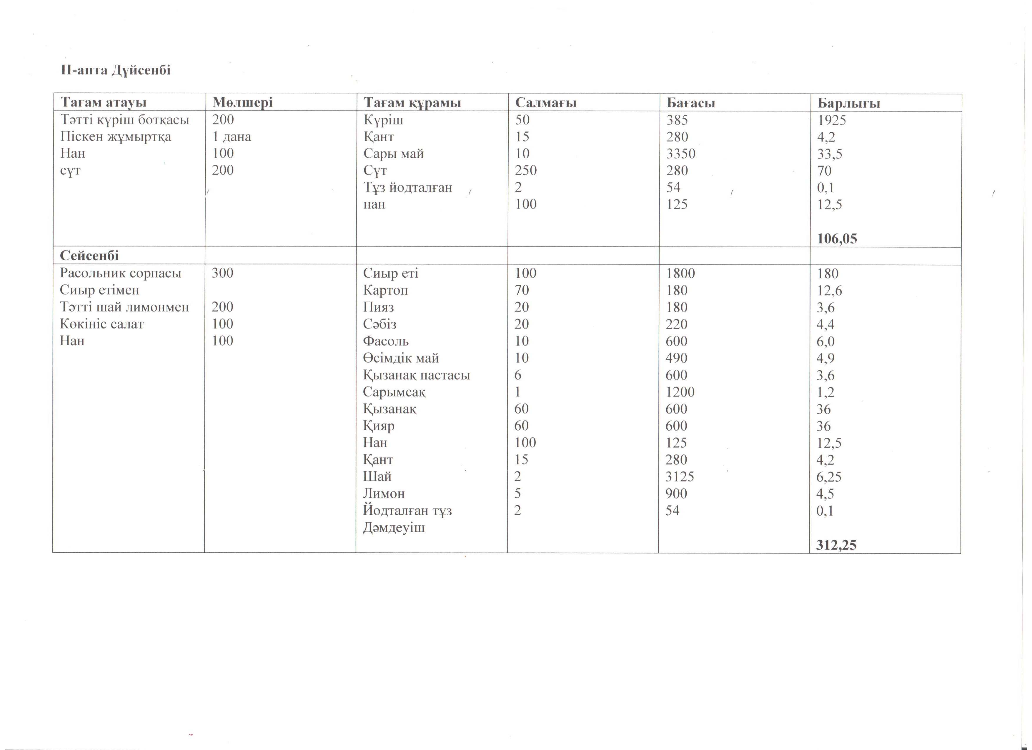2019-2020 оқу жылында тегін ыстық тамақ бастауыш сынып және әлеуметтік жағдайы қамтылған оқушыларға қыс-көктем мезгілінде берілген II апталық ас мәзірі