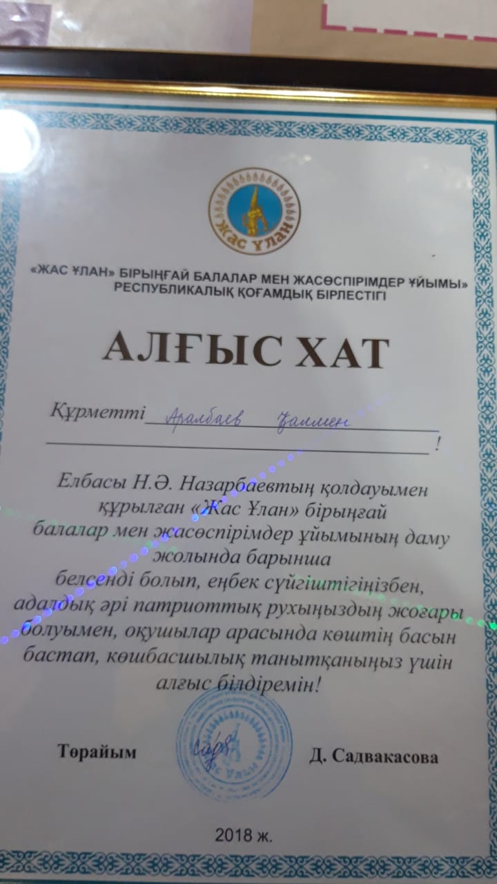 Аралбаев Қалмен "Жас ұлан"бірыңғай балалар мен жасөспірімдер ұйымы Республикалық қоғамдық бірлестігі атынан Алғыс Хат