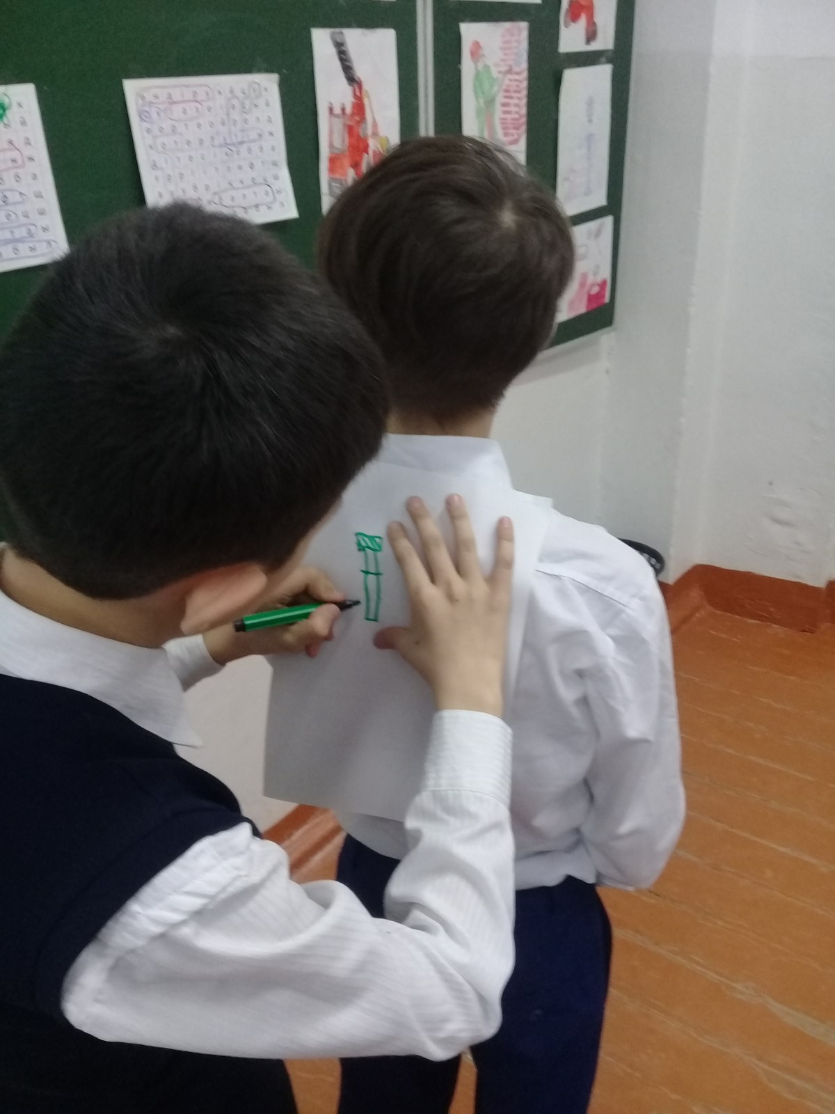 -Ойын шарты: Ойынға қатысушы арқасында өрт сөндірудің алғашқы құралдары жапсырылады. Ойыншы артына қарамай тез табу керек.
