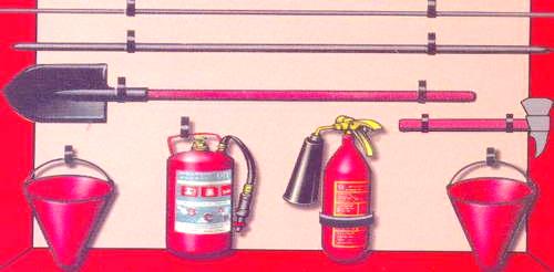 (2 көпіршікті өртсөндіргіштер, 2 шелек, күрек пен балта, багор, лом. Қалқан жанында құм салынған жәшік болуы керек.)